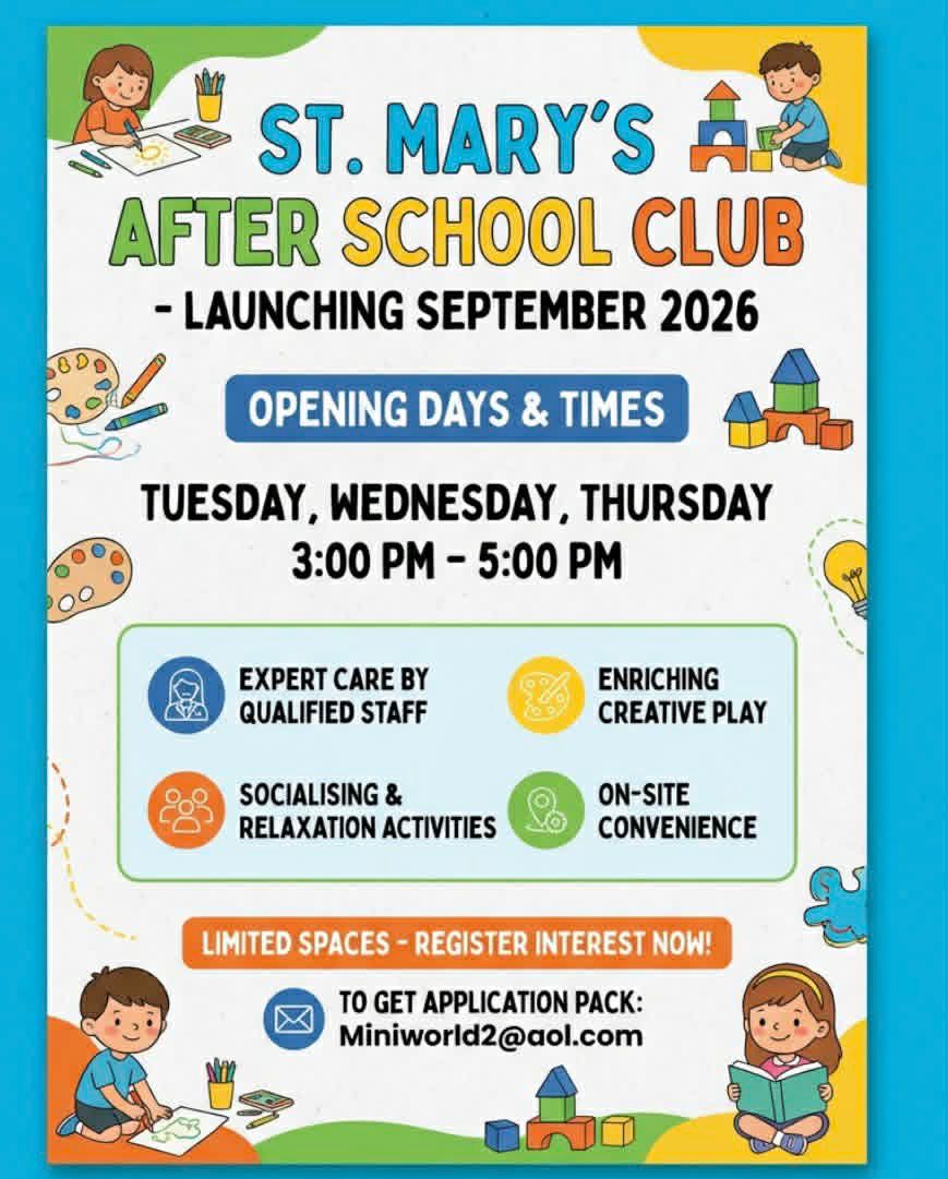 Please see attached flyer with information regarding an after-school club which will be run by Mini World at St Mary’s from September 2026.